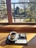 庭園を眺めるカフェテラスの席。奥に見えるのは「一言観音堂」